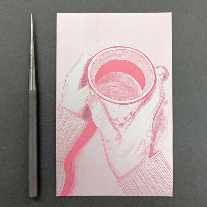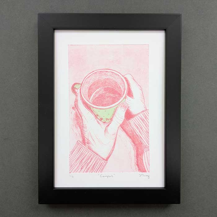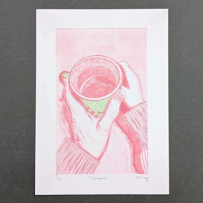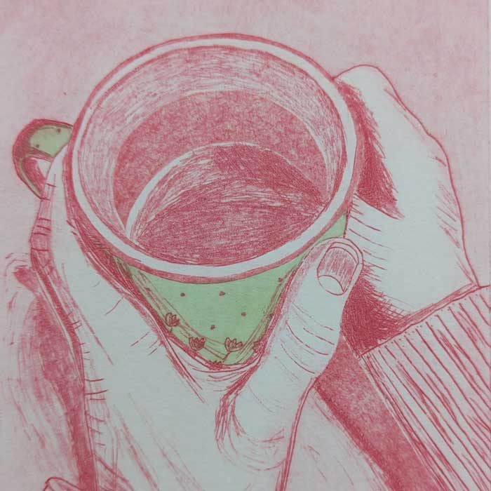Hand inked and printed original drypoint etching of a person holding a mug of tea. This is part of a series of prints called ‘moments of joy’, capturing a life giving moment.