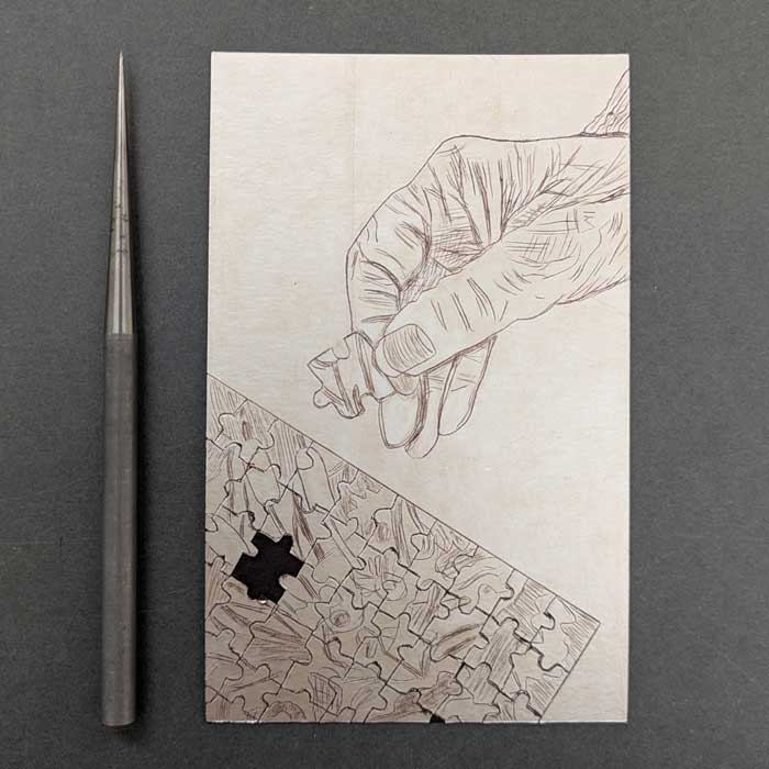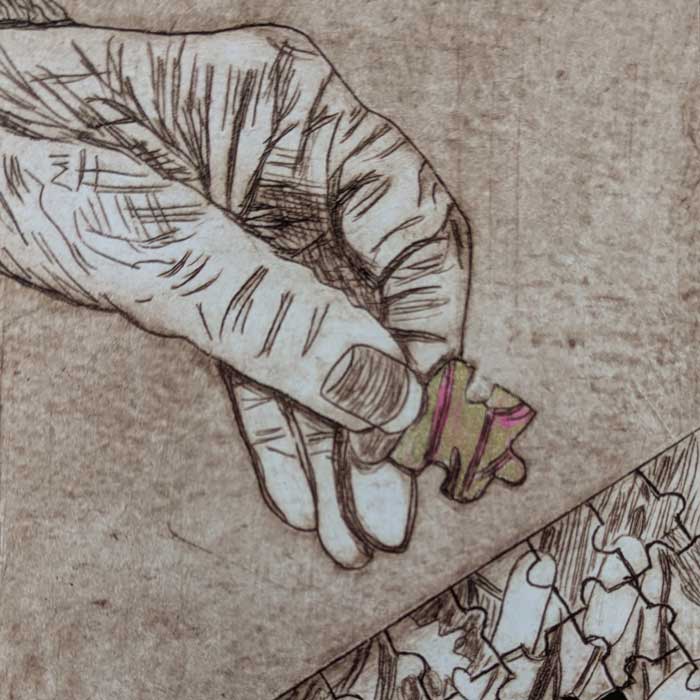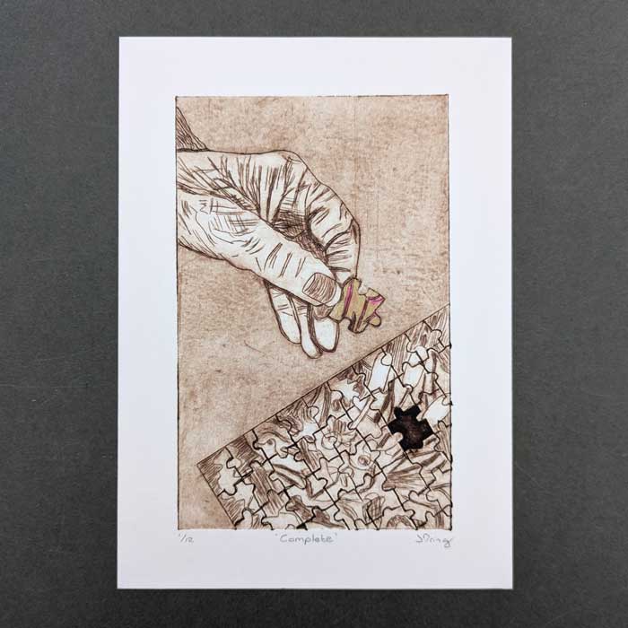 Hand inked and printed original drypoint etching of a person completing a jigsaw. This is part of a series of prints called ‘moments of joy’, capturing a life giving moment.