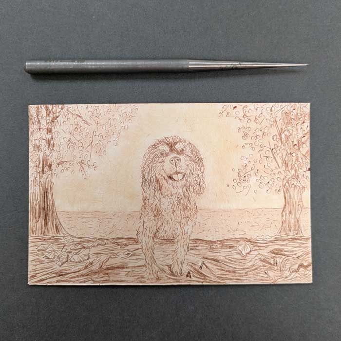 Hand inked and printed original drypoint etching of a Cavalier King Charles Spaniel on a log in the woods. This is part of a series of prints called ‘moments of joy’, capturing a life giving moment.