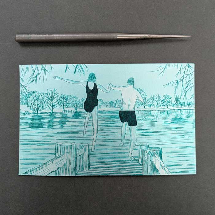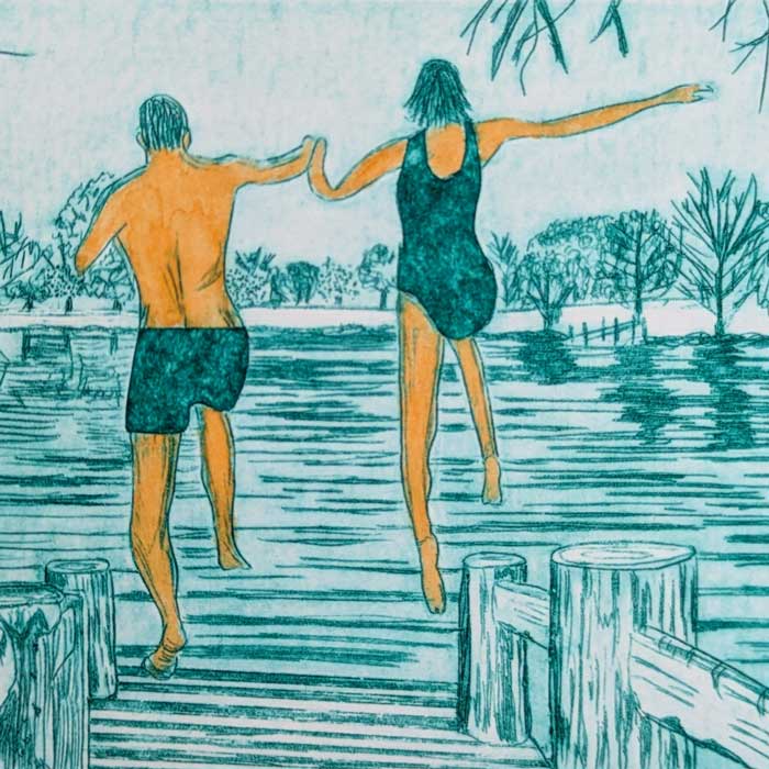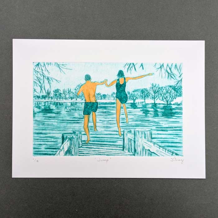 Hand inked and printed original drypoint etching of two people jumping into a lake (specifically the ‘U’ lake at Pool Bridge Farm, York.)