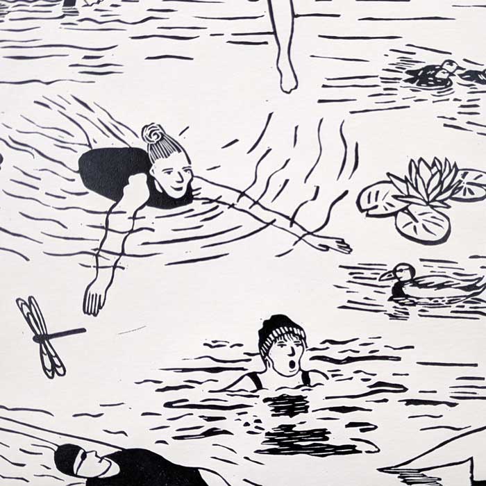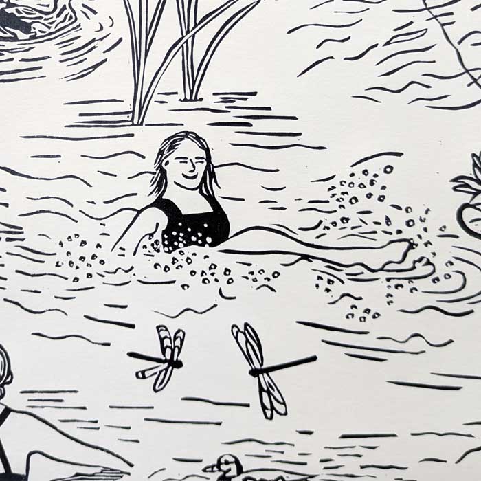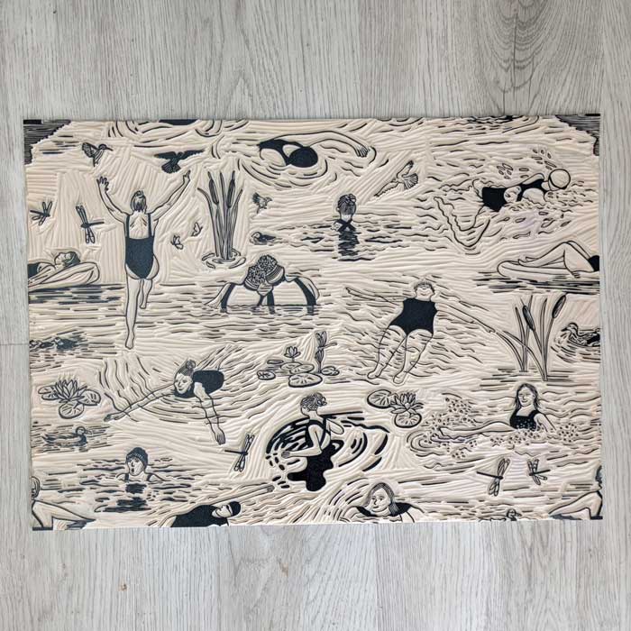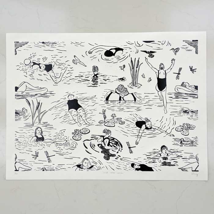 For any wild swimming enthusiasts ‘Wild water women’ is the perfect print! Showing 15 swimmers at Pool Bridge Farm, York. Hand printed from a hand carved linoleum sheet using oil-based ink onto Canaletto paper.